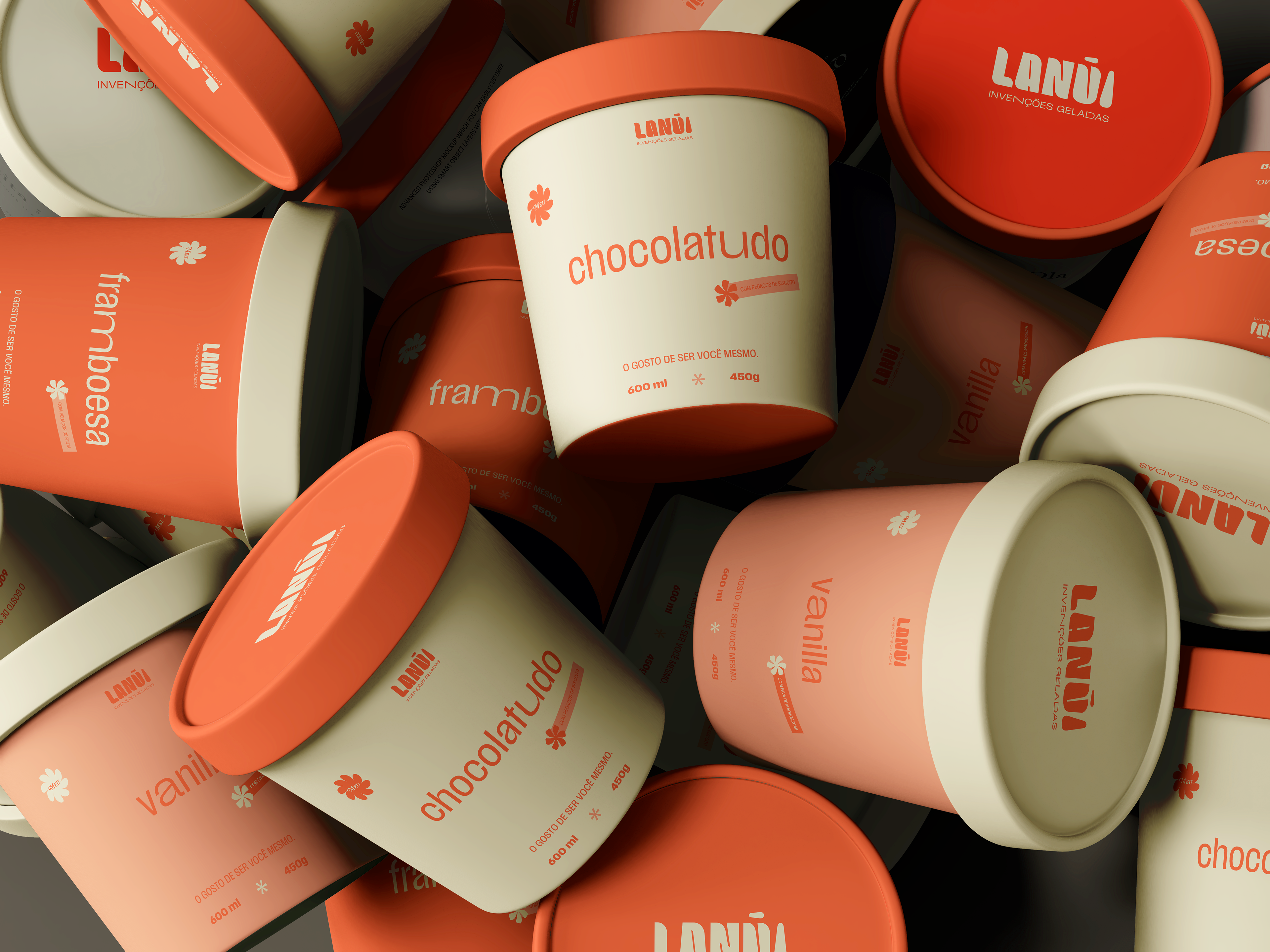 A marca de sorvetes Lanúi precisava de uma solução fosse sofisticada com toques inventivos. Lanúi vem da palavra "lanula" em latim, que significa "floco". Exploramos essa palavra, que remete à "flocos de neve", a partir de asteriscos presentes em diversas tipografias, representando a mistura de toppings e invenções.